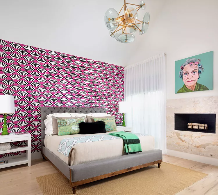 In this lively bedroom designed by Maestri Studio, a sleek slab stone fireplace is complemented by an unexpectedly quirky painting. The room features bold patterned wallpaper and charming granny chic decor, creating a playful contrast between the fireplace’s modernity and the artwork’s whimsical touch.