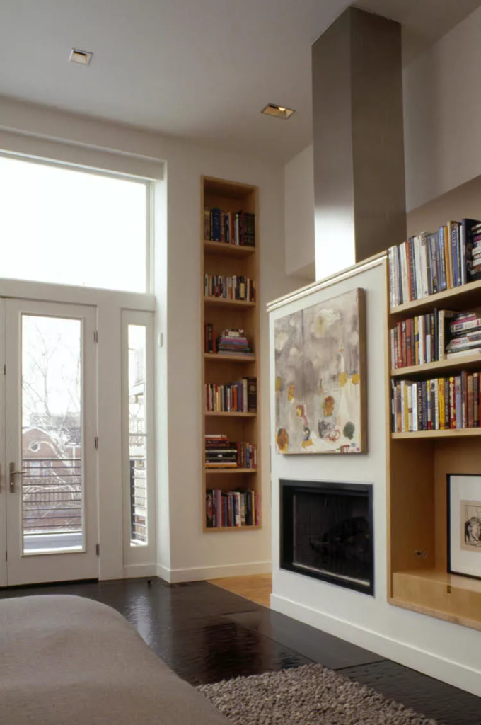Searl Lamaster Howe Architects enhanced this bedroom with an industrial flair by incorporating a stainless steel-clad chimney alongside built-in bookshelves. The fireplace’s sleek metal finish contrasts with the room’s light and airy design, adding a touch of industrial sophistication.