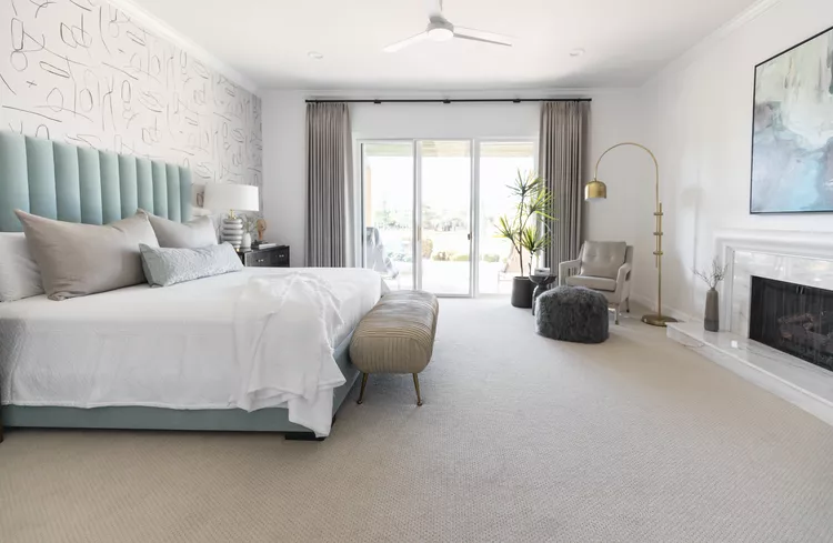 Living with Lolo’s modern bedroom features a low-profile fireplace positioned on the wall opposite a large, channel-tufted blue headboard. A large-scale painting above the mantel draws the eye upward, balancing the room’s proportions and enhancing its spacious feel.