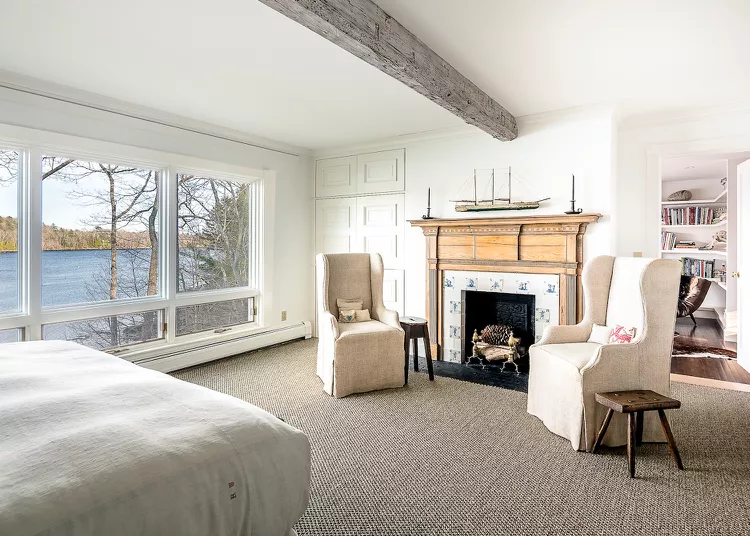 In this airy Maine bedroom, a tall antique wood fireplace mantel has been stripped to highlight its natural beauty. Paired with a tiled surround, the mantel is styled with seasonal decor, including a model sailboat and antique chambersticks, creating a charming focal point in the waterfront-view room.