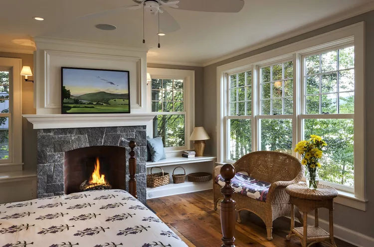 Crisp Architects designed a cozy lake home bedroom with a fireplace that blends gray stone and white wood moldings. The combination of materials adds texture and warmth, enhancing the room’s inviting atmosphere while complementing the surrounding wrap-around windows.