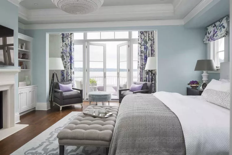 Martha O’Hara Interiors designed this Seattle waterfront primary bedroom with a palette of cool blues, grays, and lavenders. A traditional fireplace positioned across from the bed offers warmth and comfort on rainy nights, enhancing the serene ambiance of the room.