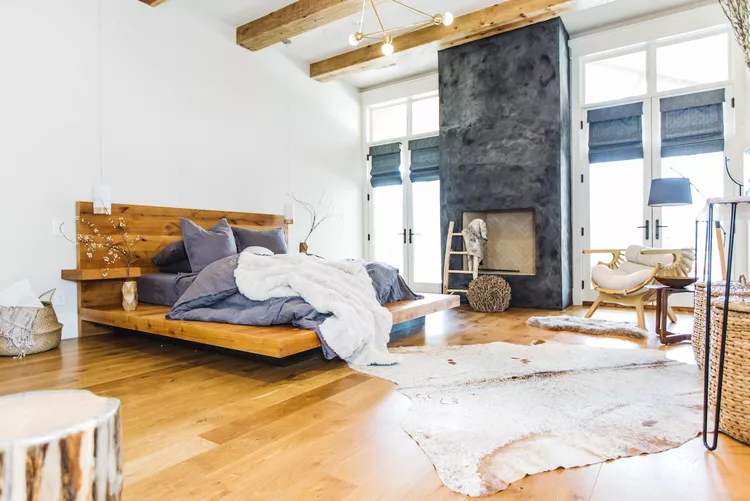Urbanology Designs introduced a floor-to-ceiling fireplace with a textured gray finish in this airy bedroom. The dramatic fireplace wall adds visual interest and contrasts with the golden wood tones and white walls, while casually styled decor in front of it enhances the room’s relaxed yet sophisticated vibe.
