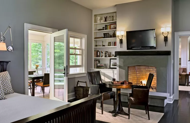 Crisp Architects elevated the fireplace in this bedroom by a step, making it more accessible and adding functionality. The raised fireplace provides a visible focal point and creates a perch for decorative elements, enhancing the room’s usability and visual appeal.