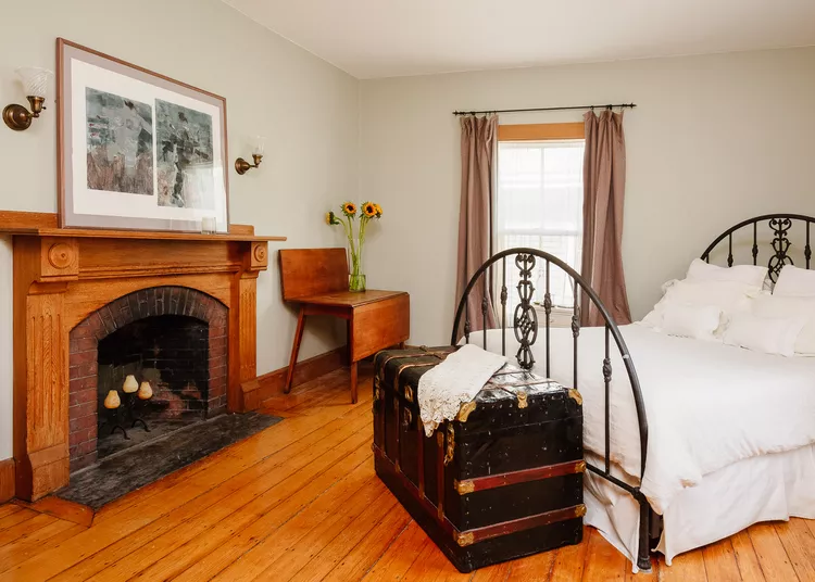 In this room, a vintage-style metal bed is angled to optimize the view of a mixed-material fireplace. The fireplace, featuring weathered brick and carved wood stained to match the warm tones of the flooring and corner table, becomes a striking visual element in the cozy space.