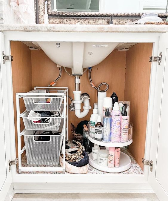 For those with limited space under the sink, small bins are an excellent solution. These bins slide neatly into the cabinet without taking up much vertical space. They maximize every inch of the cabinet, accommodating numerous bathroom accessories. Small bins look great and are perfect for storing smaller items without appearing cluttered.
