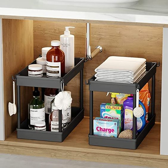 An expandable shelf rack under the sink stands out for its unique ability to create additional space for bathroom accessories. As the name suggests, this shelf rack can expand, allowing you to make the most of the space inside your bathroom cabinet. It’s an efficient solution for those looking to fully utilize their cabinet’s capacity.