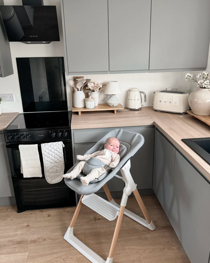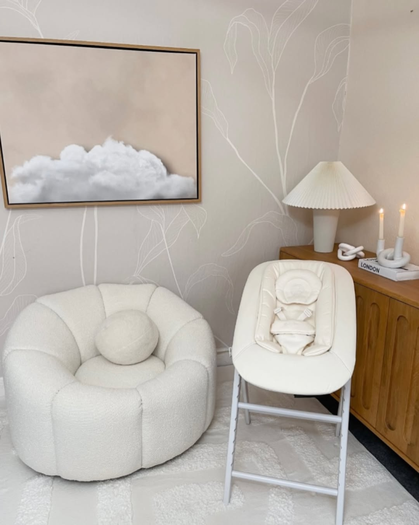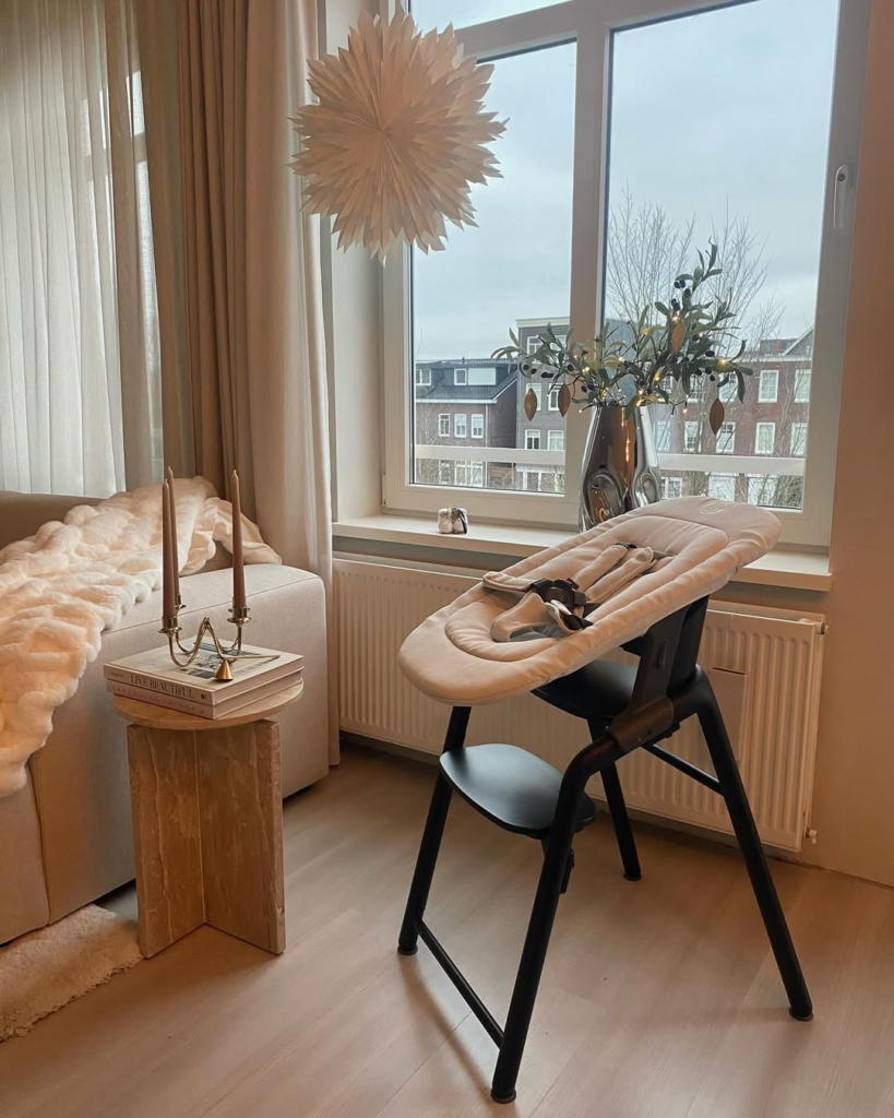 This chair transitions effortlessly between the kitchen and living room, thanks to its soft neutral tones and relaxed design. It feels almost lounge-like, making it suitable for feeds, playtime, and quiet moments without disrupting the flow of the space. The design prioritizes comfort while maintaining a clean, cohesive look. It’s an excellent option for open living areas where furniture needs to feel cohesive rather than purpose-specific.