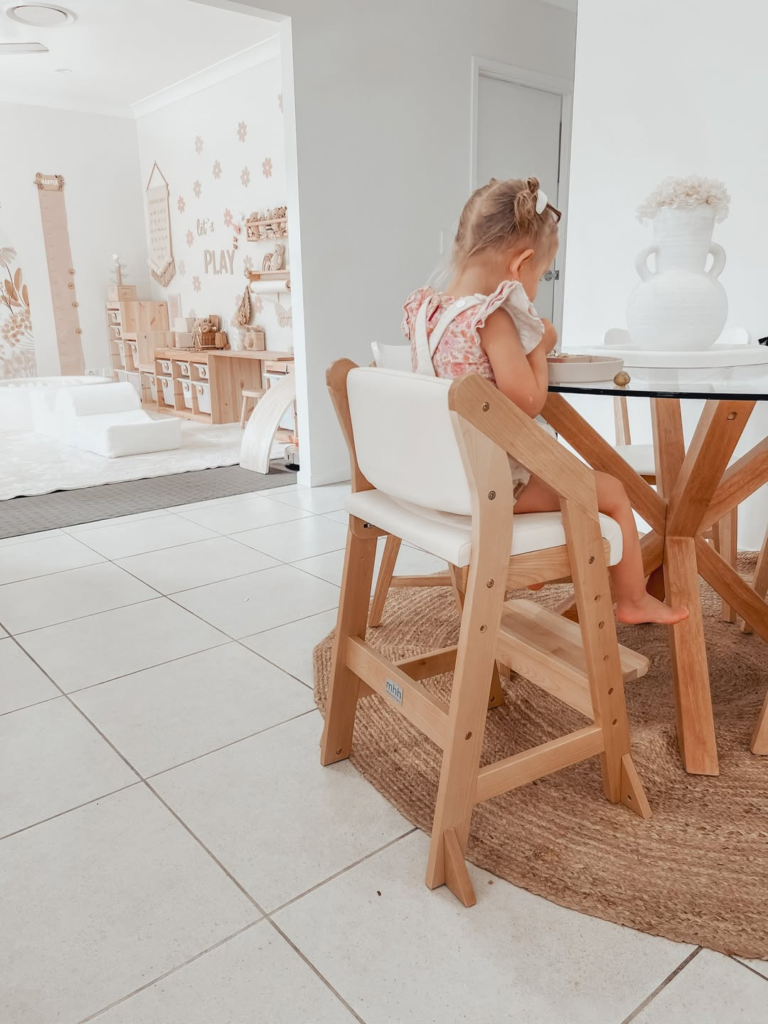 Natural wood finishes paired with creamy upholstery create a serene, purposeful aesthetic. Inspired by Montessori principles, the design feels calm, accessible, and intentional. Every element serves a function while maintaining visual softness. The timeless look allows the chair to grow with the home rather than feel outdated. It’s practical, adaptable, and designed to support both child development and cohesive interior design.