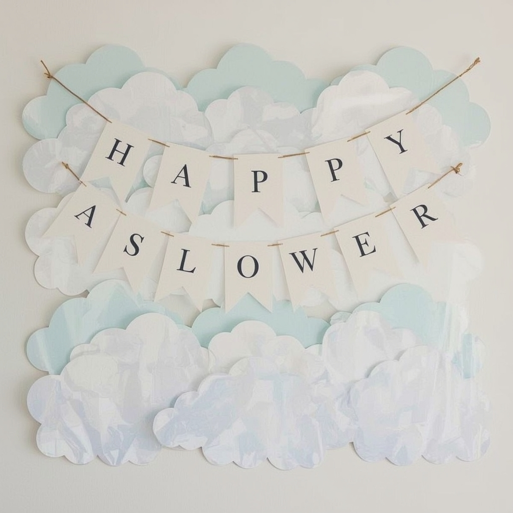 Layer cloud-shaped pieces for a dreamy banner effect. Add gentle text across the clouds to maintain a whimsical but soft aesthetic.