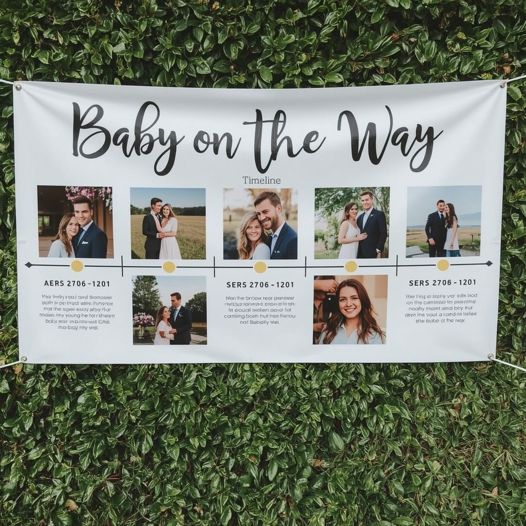 Turn the banner into a visual timeline, featuring photos from the parents’ journey leading to the baby shower. Each section highlights a meaningful moment before “Baby on the Way.”