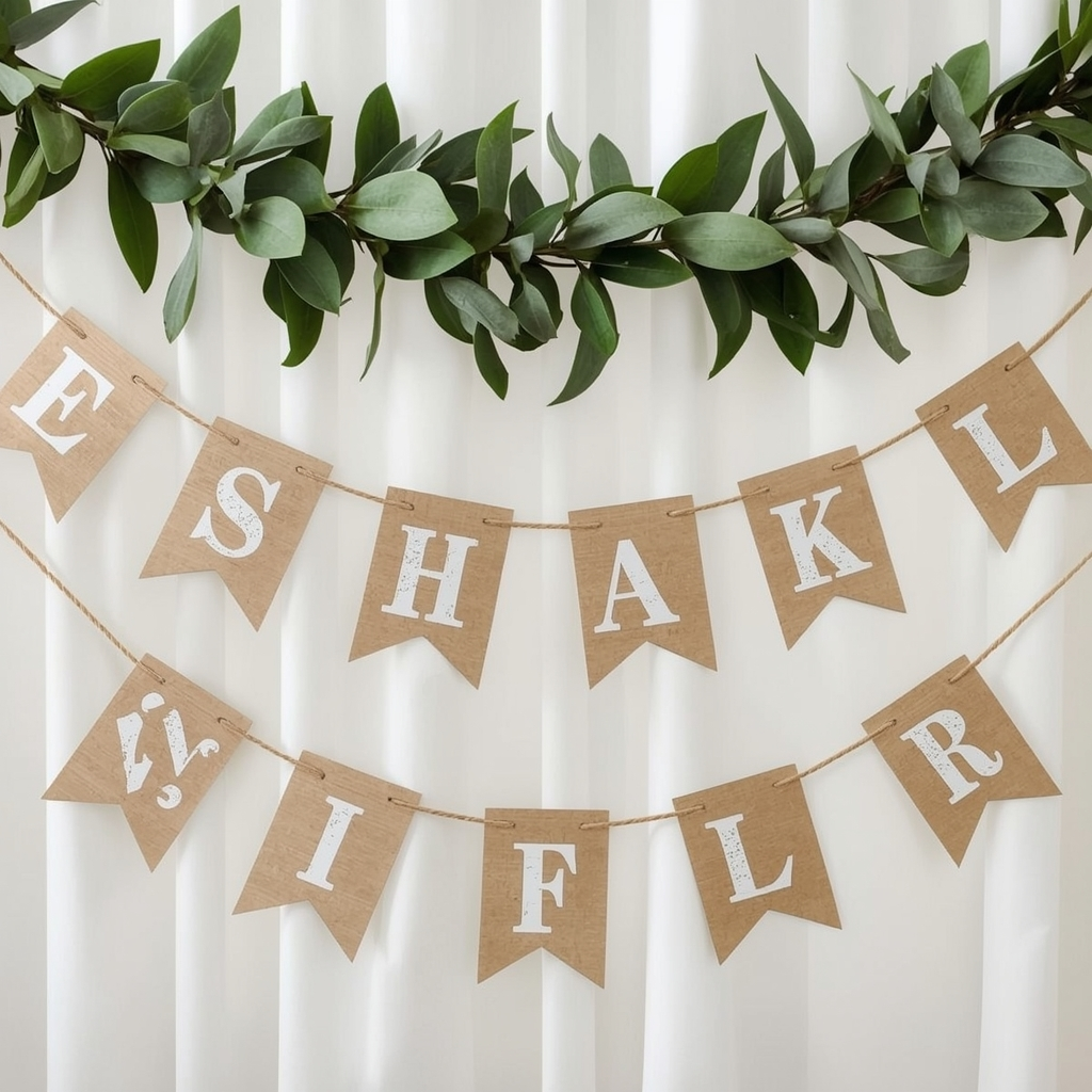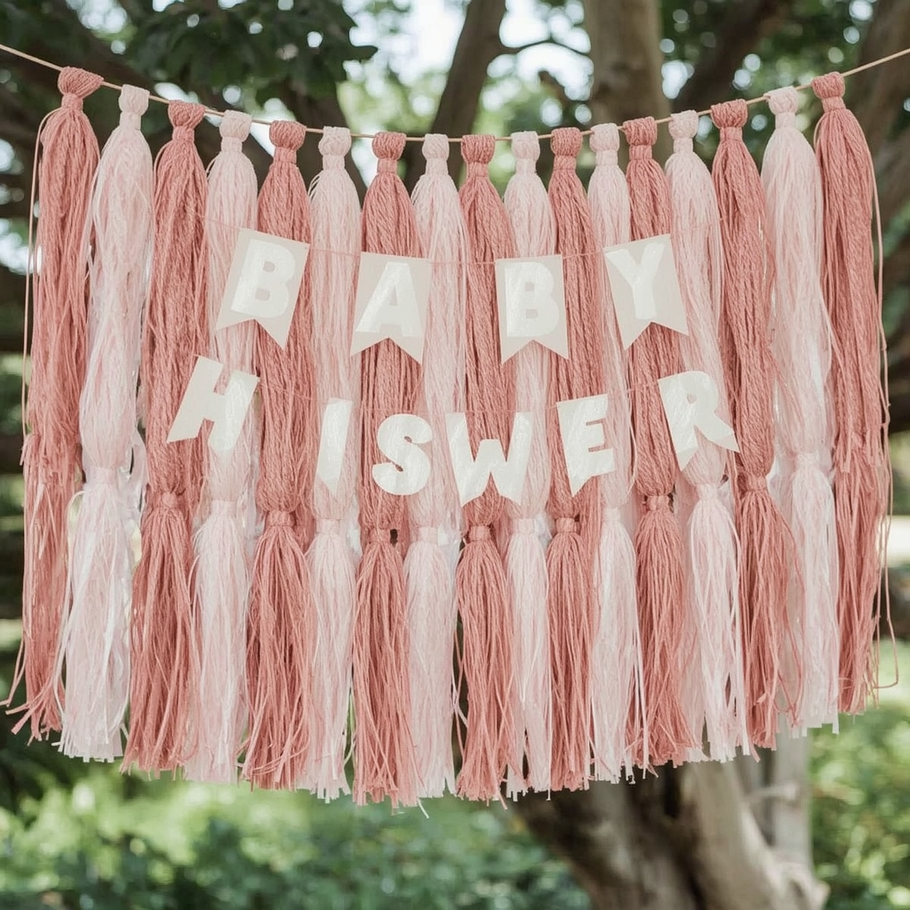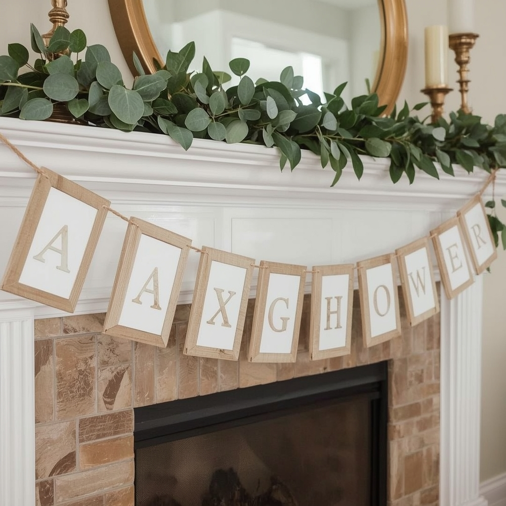 Thin wooden letters or shapes strung on twine bring natural warmth to the banner. The texture works beautifully for rustic, neutral, or greenery-accented showers.