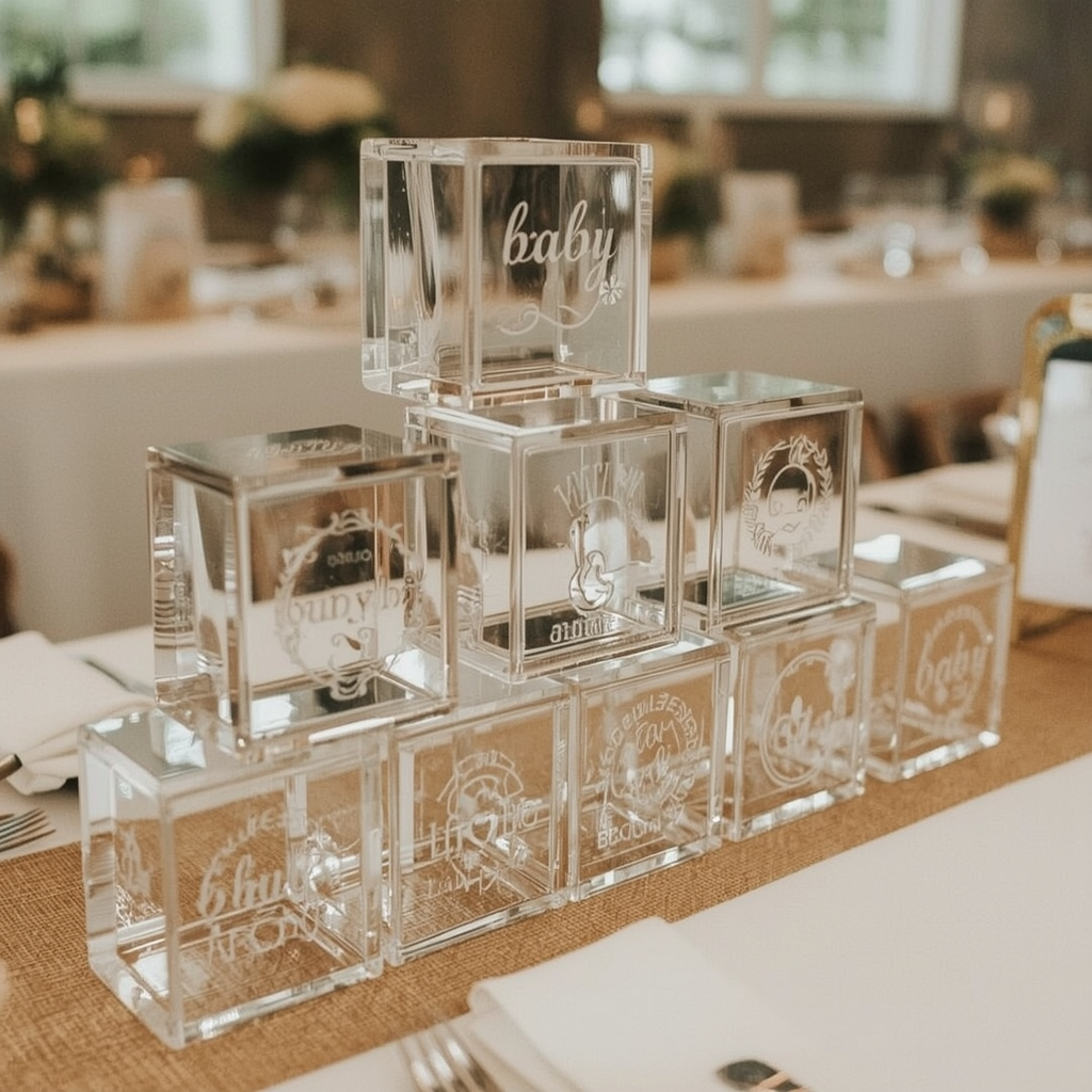 Clear acrylic blocks featuring baby-themed words or icons can create a sleek, modern table display. Stack them or space them evenly along the table to maintain balance and visual flow.