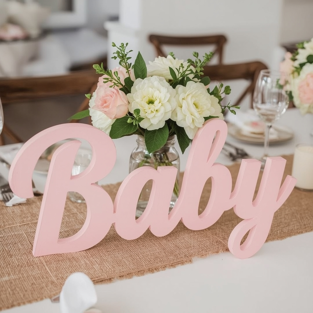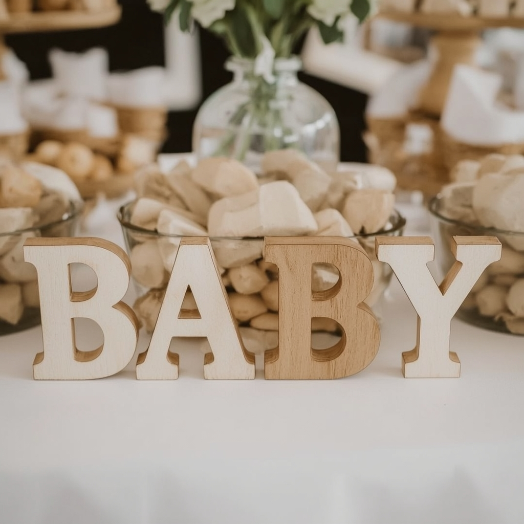 Small wooden letters spelling “BABY” or the baby’s initials add charm and warmth to the table. Paint or stain them in tones that complement your theme for a polished finish.