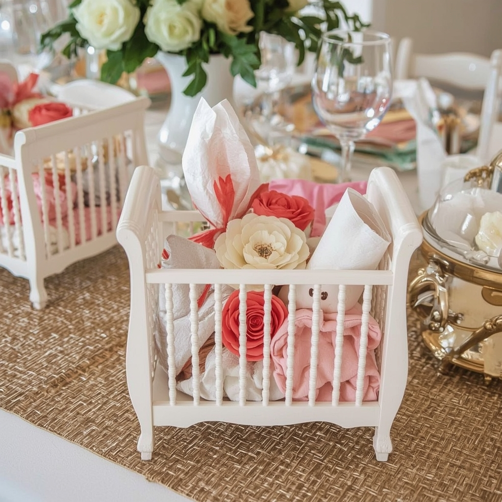 Decorative mini cribs make adorable table focal points. Fill them with flowers, folded napkins, or baby-themed items to add texture and interest.