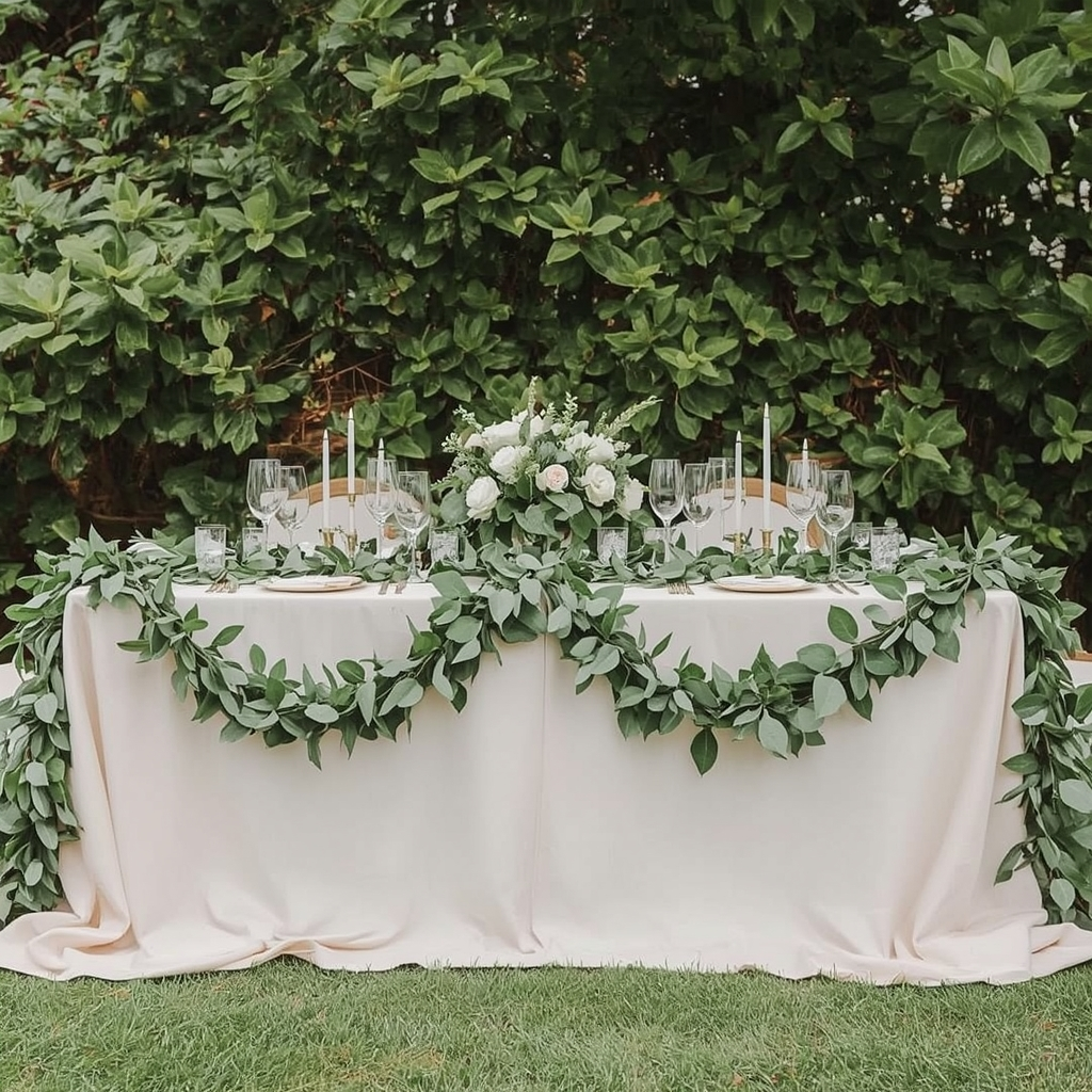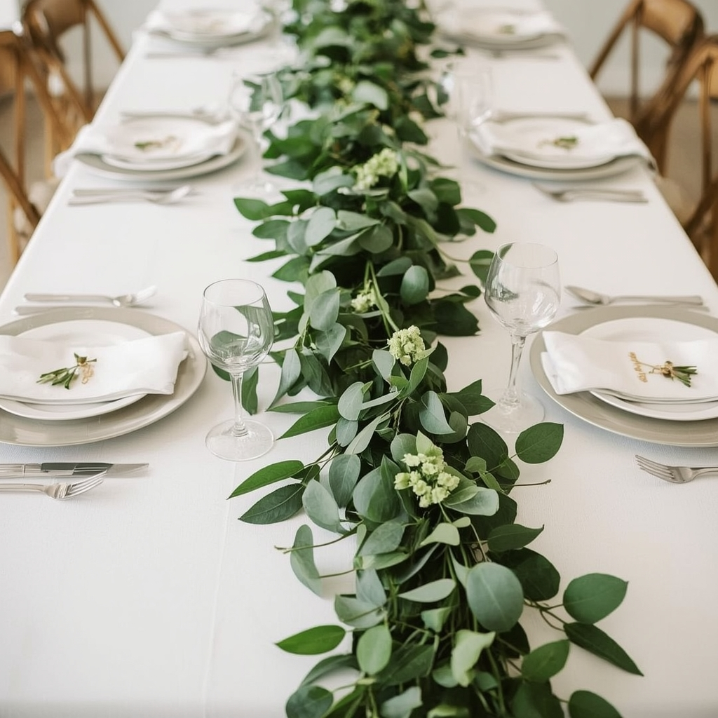 Soft fabric or faux greenery garlands create effortless table décor. Drape them loosely across the center of the table for a natural, flowing look rather than arranging them in rigid lines.