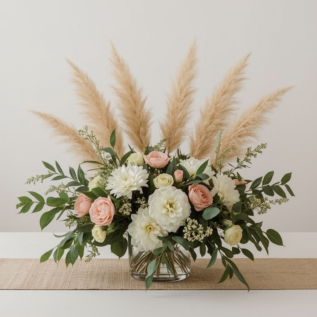 Low arrangements mixing pampas grass with soft florals create airy, modern centerpieces. Keep heights minimal so guests can converse easily across the table.