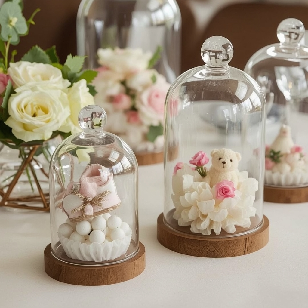 Glass domes create a refined look while keeping tables organized. They’re perfect for elegant, modern, or high-end baby shower themes.