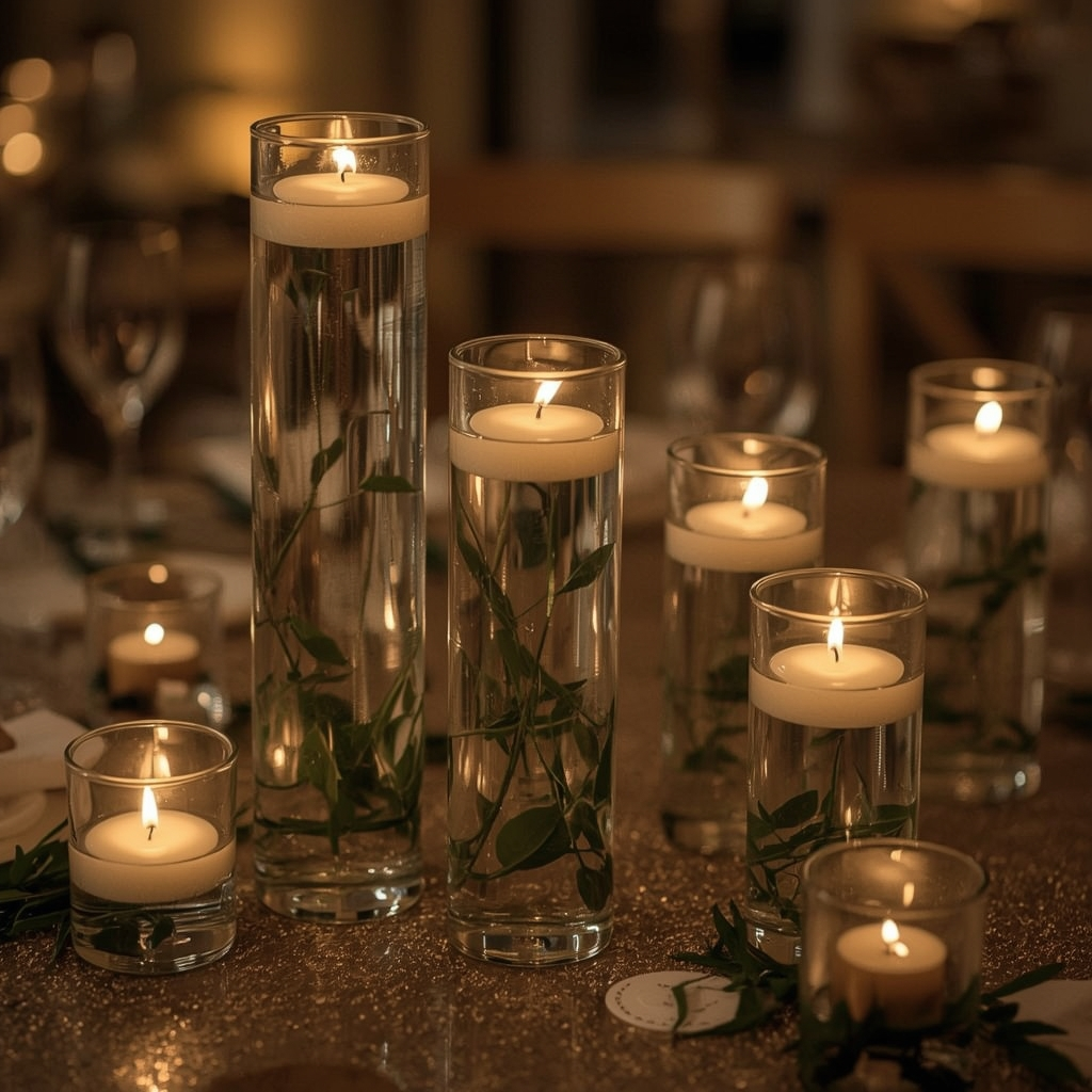 Use water-filled cylinders with floating candles to create a gentle, warm glow on the table. Pair them with low greenery or florals for added visual appeal.