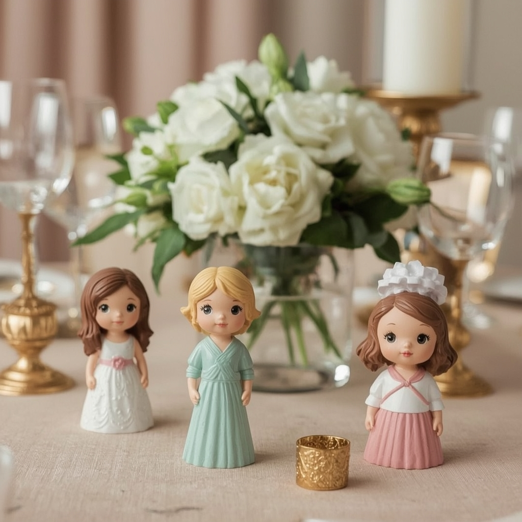 Small, themed figurines placed between centerpieces help tie your table décor to the shower’s theme. Choose soft colors and simple designs to maintain cohesion.