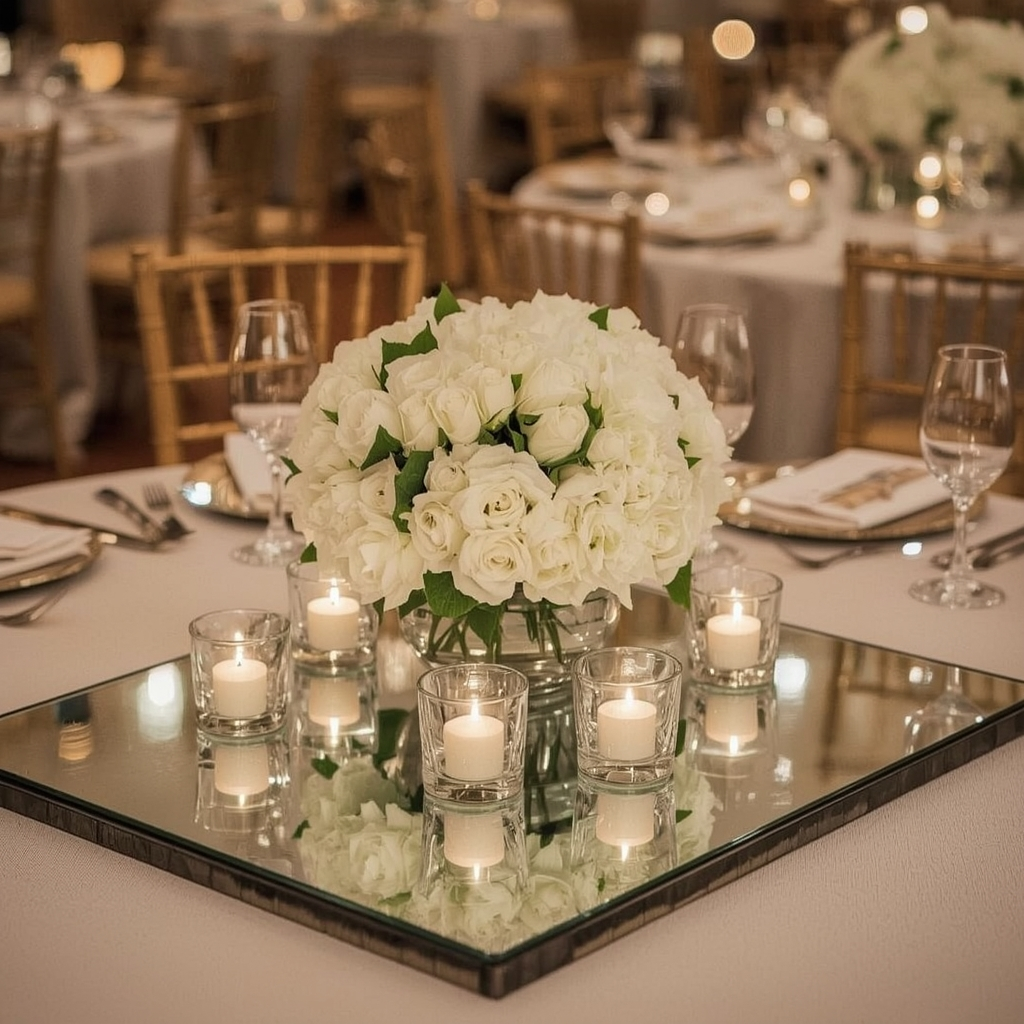 Mirror bases instantly brighten the table and create depth without adding additional décor pieces. They work exceptionally well for evening events or elegant, high-style setups.