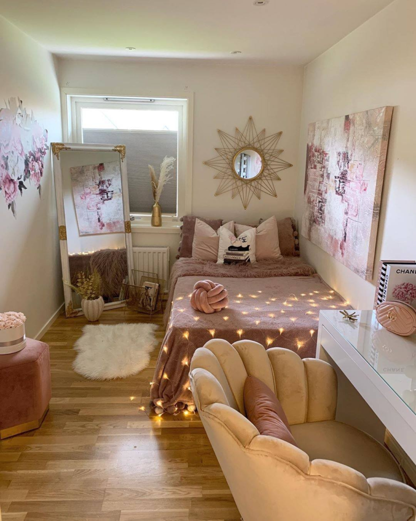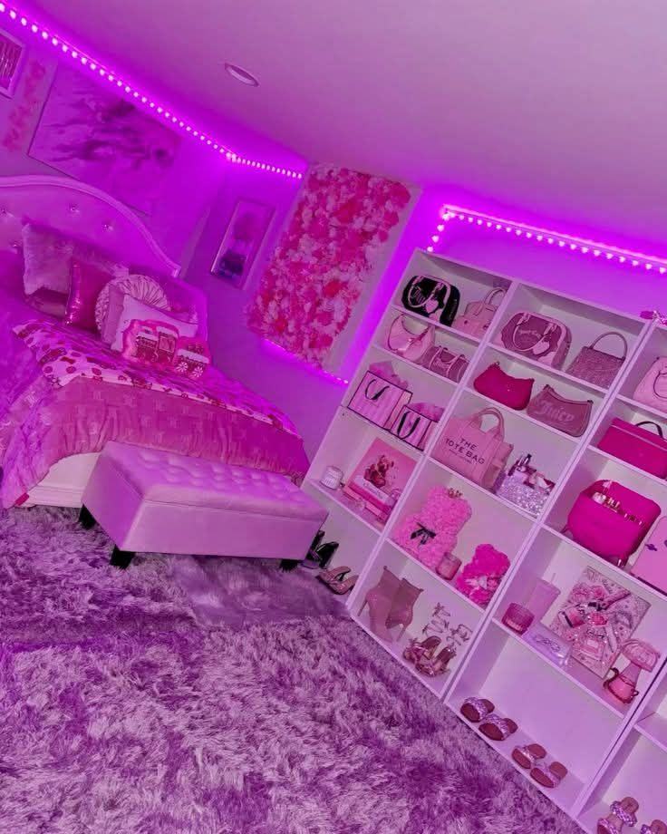 Blush tones, soft furnishings, and delicate lighting transform this bedroom into a dreamy escape. Every detail contributes to a romantic, feminine ambiance that feels enchanting without being overpowering. It’s a space that combines baddie energy with subtle softness, perfect for those who love glam aesthetics while still valuing comfort and intimacy.