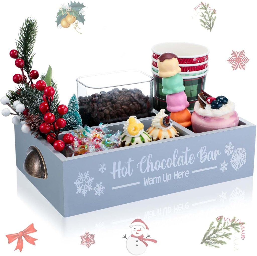 This hot cocoa bar embraces nostalgic charm with classic signage and decorative details. Banners, labels, and chalkboard-style elements give the setup a playful yet cohesive look. It’s an easy way to create a memorable drink station that feels both interactive and visually appealing.