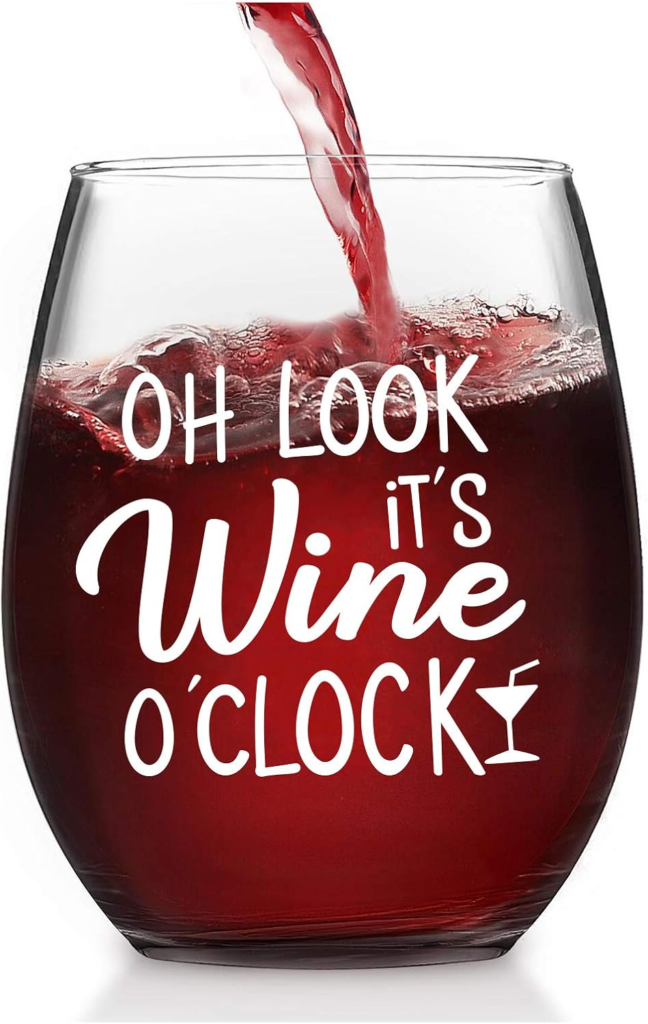 A humorous wine glass adds a relaxed, playful note to a bar cart. Lighthearted messaging sets the tone for casual entertaining and helps the space feel approachable. Paired with a few favorite bottles, it creates a simple yet charming wine-focused setup.