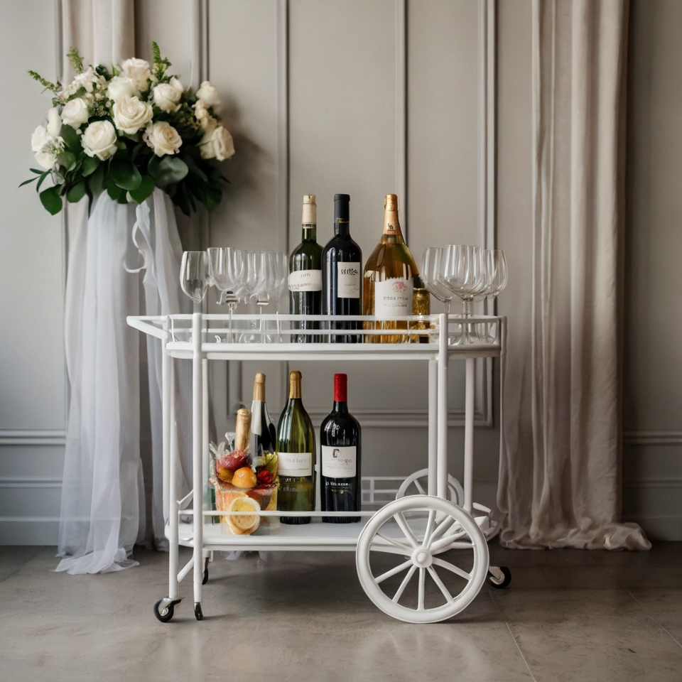 A white bar cart is a timeless choice for weddings and formal events. Clean lines and a crisp finish create a neutral backdrop that blends seamlessly with a variety of décor styles. Thoughtfully stocked, it serves guests gracefully while adding a refined touch to the celebration.