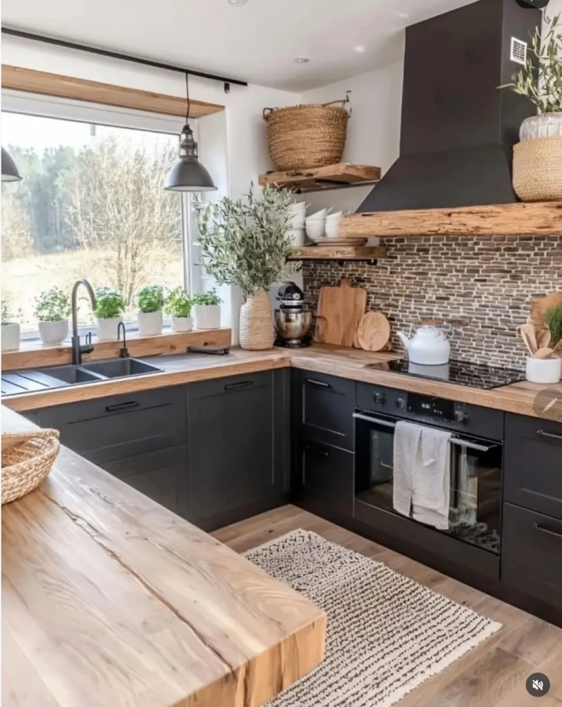 Bold and expressive, this kitchen embraces contrast and personality. Matte black cabinetry sets a dramatic foundation, warmed by natural wood countertops and softened by lush greenery. The presence of plants brings life and movement into the space, preventing it from feeling heavy or closed in. Styling feels relaxed and organic, with art and everyday objects displayed in a way that feels authentic rather than staged. This kitchen celebrates creativity and individuality, offering a moody yet inviting environment where functionality and self-expression coexist.