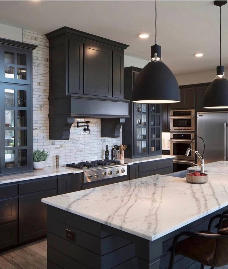 Black kitchens work beautifully in both small and large spaces when balanced with proper lighting and smart layout choices. Open shelving, textured backsplashes, and warm hardware prevent the space from feeling heavy.