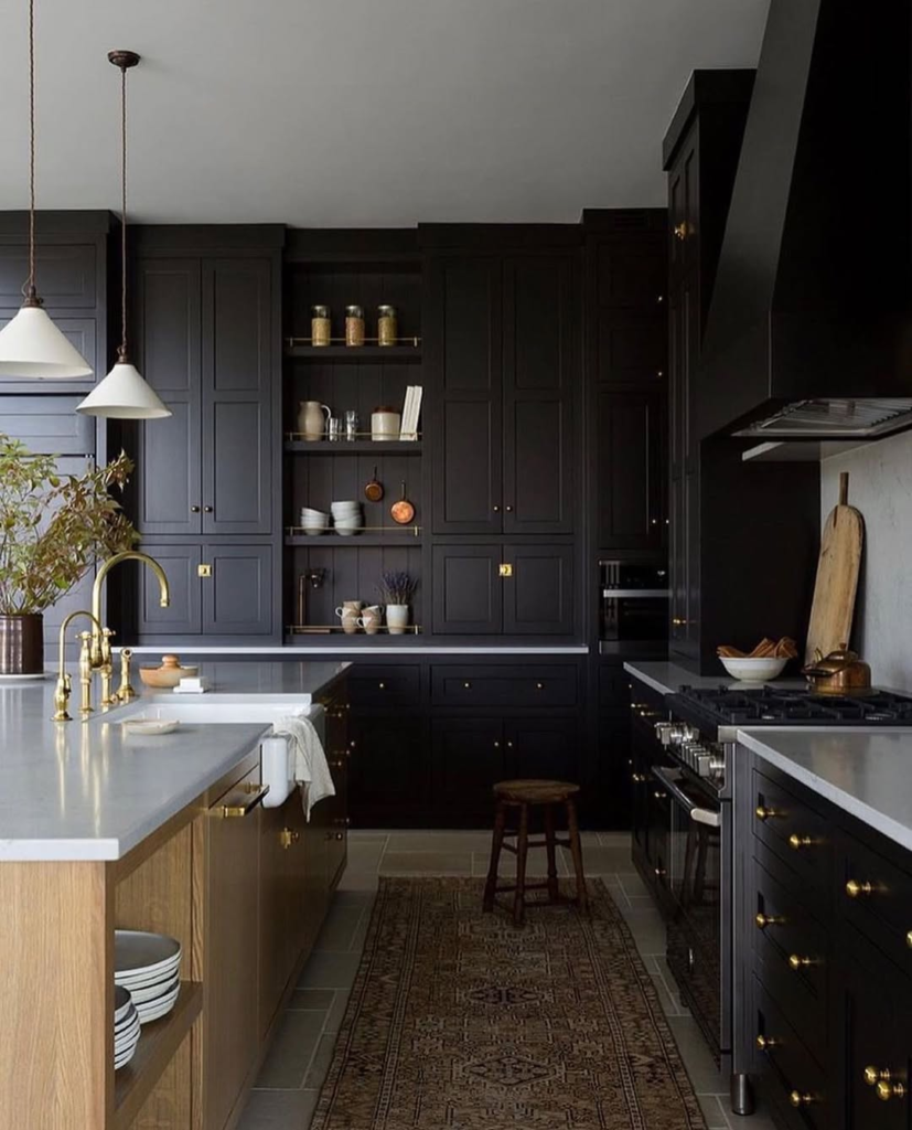 There is an undeniable comfort in a kitchen that blends depth with elegance, and this design does exactly that. Dark cabinetry establishes a strong, grounding presence, while soft wood shelving lightens the visual weight and adds warmth. Brass hardware acts like subtle adornment, enhancing the space without overpowering it. What truly sets this kitchen apart is its lived-in feel. Thoughtful details such as a textured runner and generous natural light make the room feel welcoming and personal rather than overly styled. It’s a space that balances polish with comfort, proving that luxury can still feel familiar and easy.