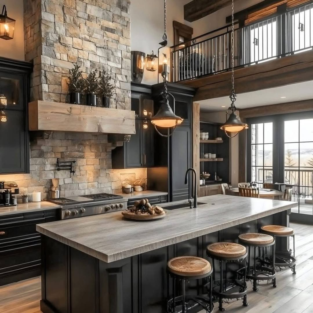 This kitchen draws inspiration from mountain retreats, combining dramatic architectural features with refined finishes. Dark cabinetry adds depth, while natural wood tones keep the space grounded and inviting. Statement lighting and bold textures create visual interest without overwhelming the room. Despite its strong presence, the kitchen feels comfortable and livable, suited to both everyday use and special occasions. It’s a design that merges rustic influence with modern sensibility, resulting in a space that feels both grand and welcoming.