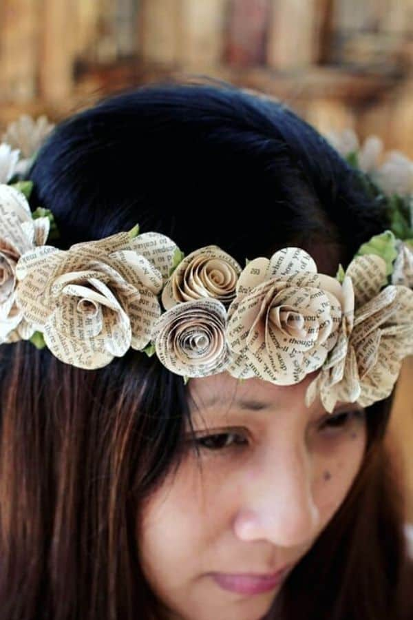 Delicate flowers made from book pages can form a whimsical crown. Perfect for events, photography, or as a decorative statement, these crowns blend rustic elegance with literary charm.