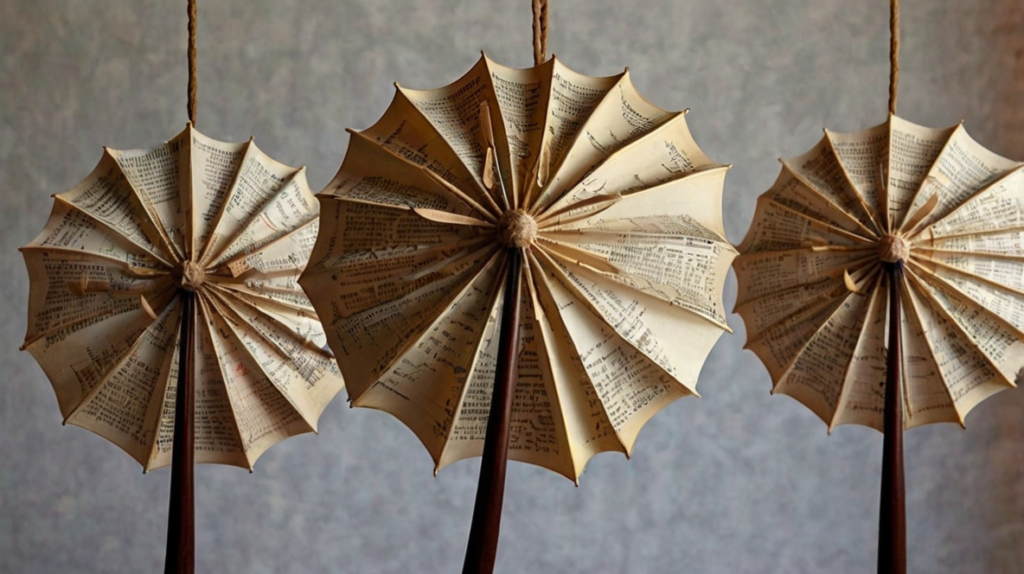 These charming umbrellas are crafted from folded book pages and hung for whimsical décor. Their gentle curves and vintage appeal bring movement and light to any room.