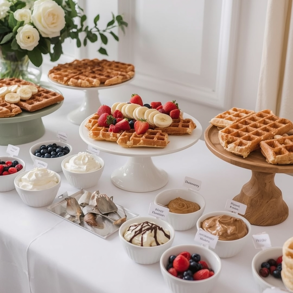 Design an interactive waffle bar that allows guests to customize their own sweet creations. Offer mini waffles arranged neatly on platters or warming trays so they stay fresh throughout the event. Provide a variety of toppings such as fresh berries, sliced bananas, honey, whipped cream, chocolate drizzle, nut butter, and powdered sugar. Keeping the toppings in small labeled bowls ensures the display looks organized and inviting.