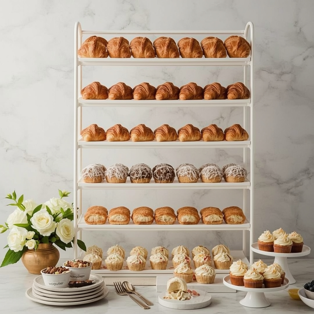 Create a standout feature with a vertical pastry wall or tiered dessert stand. Display croissants, muffins, danishes, and sweet rolls in an organized and visually appealing way. This arrangement not only saves table space but also adds height and dimension to the food display.