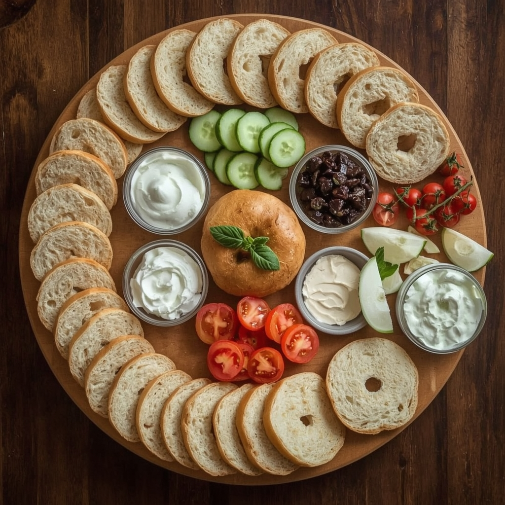 Offer a large bagel board featuring sliced bagels arranged alongside a variety of spreads and toppings. Include options such as plain and flavored cream cheeses, sliced cucumbers, tomatoes, capers, fresh herbs, and plant-based smoked alternatives for a diverse selection.
