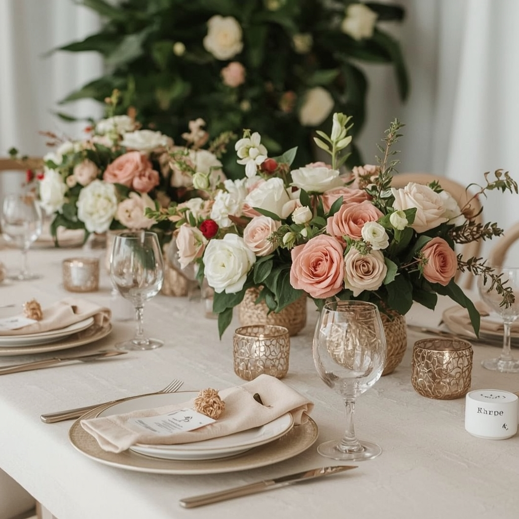Elevate the brunch tablescape with fresh floral arrangements, soft linens, and simple place settings. Low centerpieces allow guests to converse easily across the table while still adding beauty to the space.