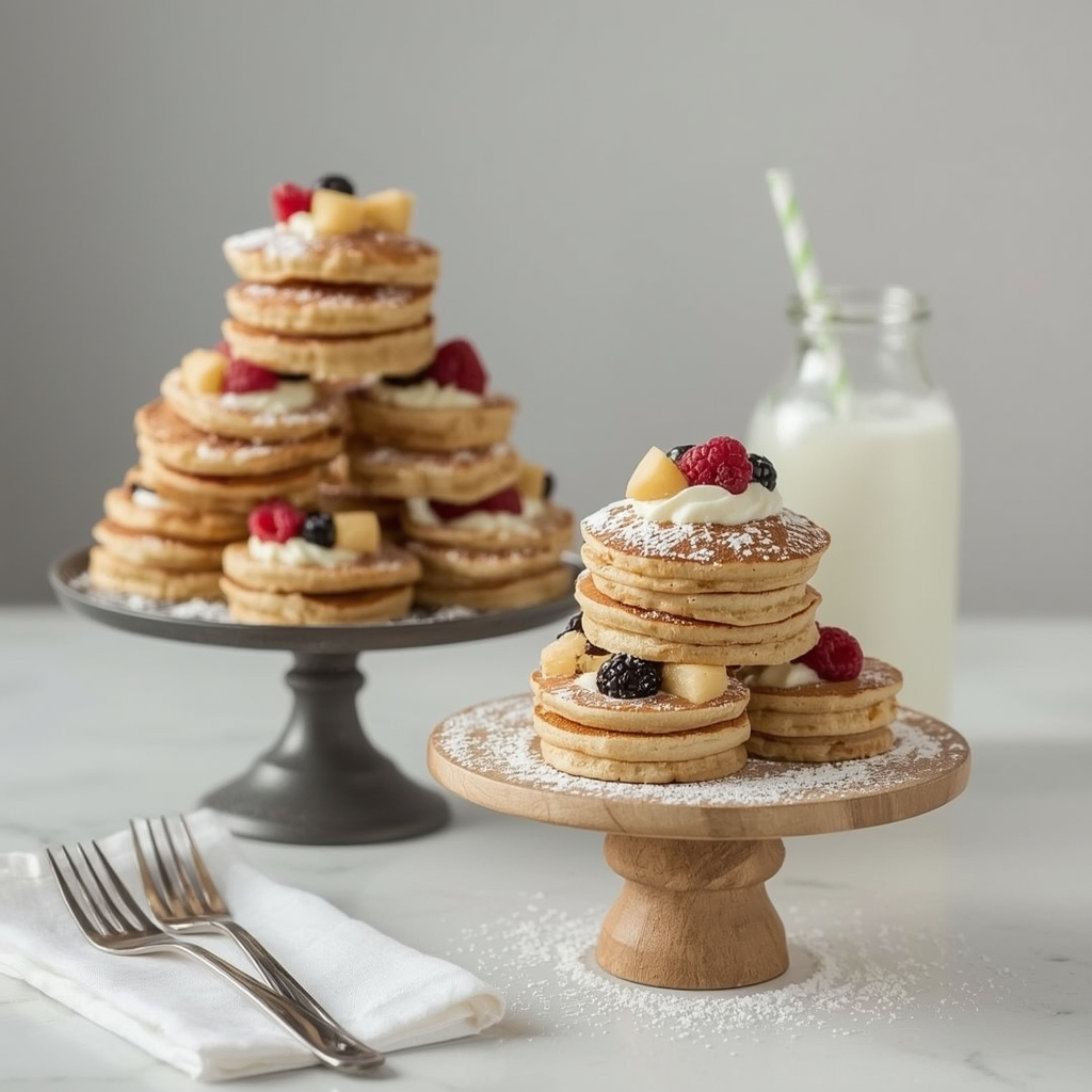 Serve mini pancake stacks layered with fruit, syrup, or whipped toppings. Arrange them on tiered stands for a charming café-style presentation. Dust with powdered sugar for an extra decorative touch.