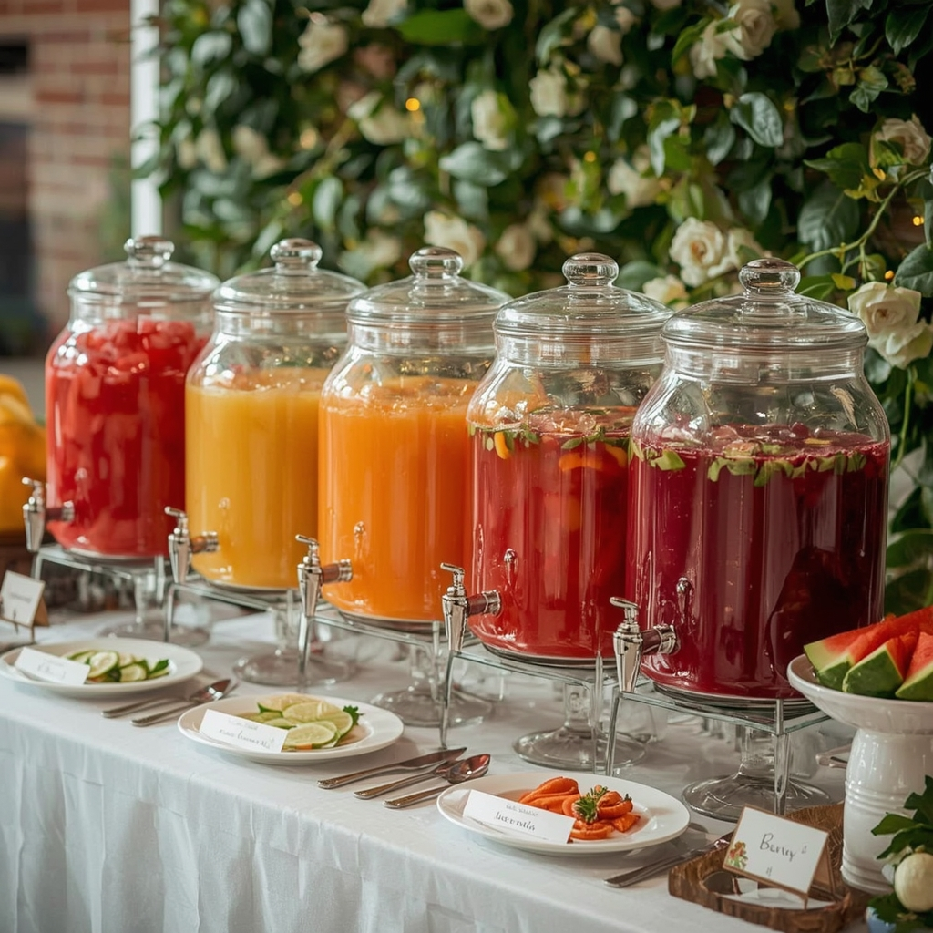 Set up a colorful juice bar with freshly prepared juices such as watermelon, orange, carrot, and berry blends. Display them in clear dispensers to highlight their vibrant colors. Add labeled signs so guests know their options.