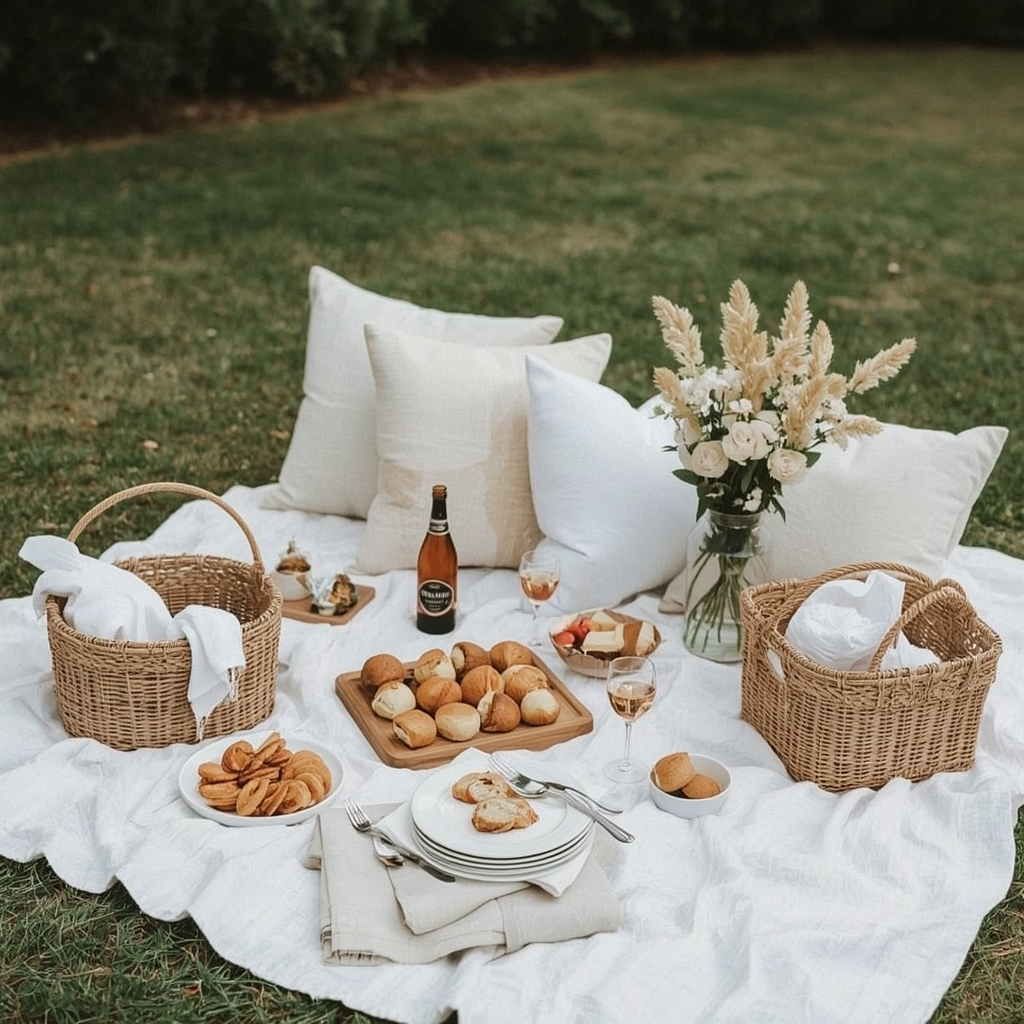 Keep the décor simple with soft cushions and neutral fabrics. Outdoor settings like backyards or parks enhance the relaxed ambiance. Ensure food is stored safely and shaded if needed.