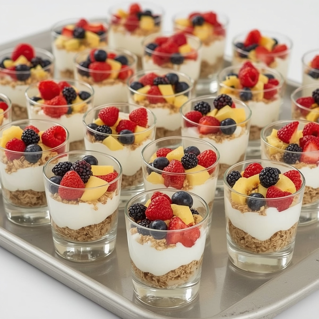Serve individual yogurt parfaits layered with granola and fresh fruit. Use clear cups or small jars to showcase the colorful layers. Arrange them neatly on trays for easy access.