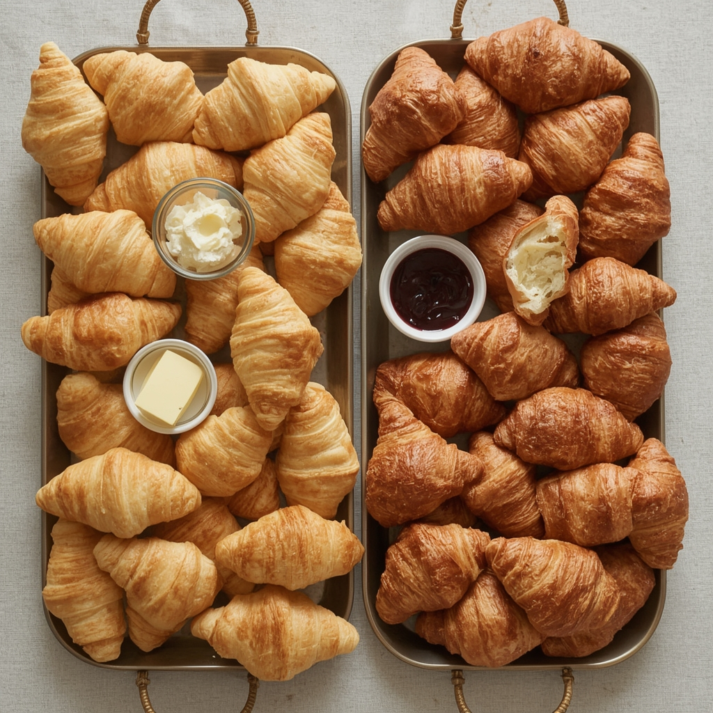 Display plain and filled croissants on serving trays with small dishes of butter, jam, and honey. The flaky texture and rich flavor make croissants a brunch staple.