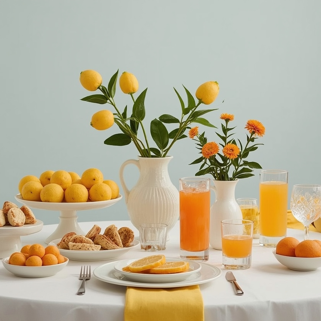 Add energy to the brunch with citrus-inspired décor. Decorate tables with lemons, oranges, and soft yellow accents. Pair the décor with citrus pastries, infused water, and fresh juices.