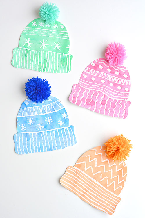 This winter hat art project introduces kids to a fun resist-painting technique. Using a white crayon or pastel, they can draw patterns on a hat template before painting over it with watercolors.