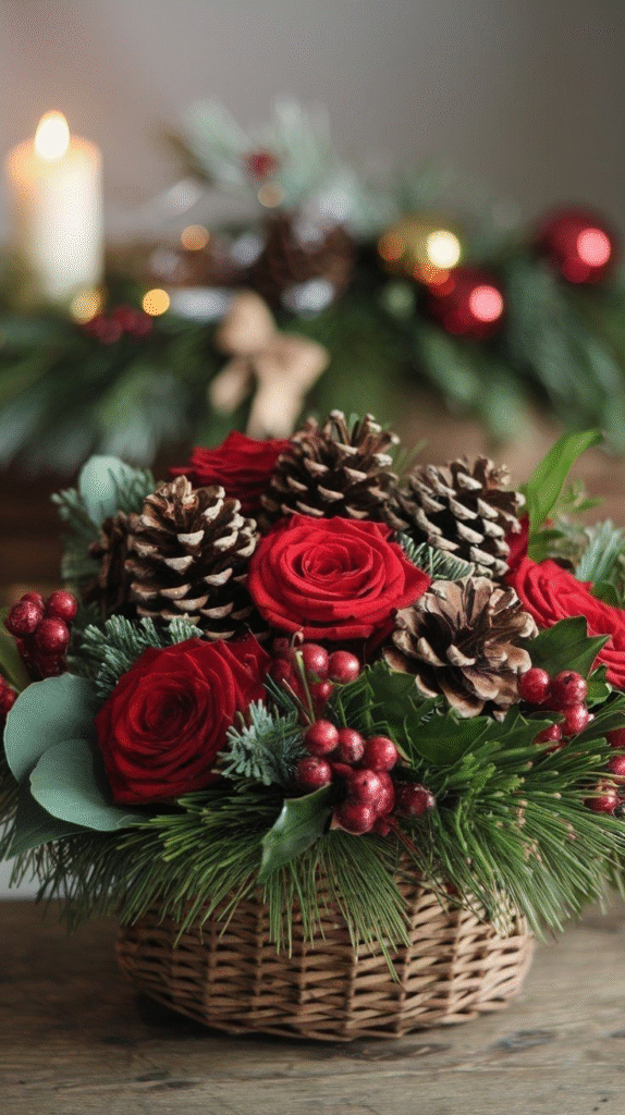 A whimsical floral design brings a hint of mystery and fantasy into your holiday décor. This idea incorporates delicate elements and subtle details that make the arrangement feel magical. It’s an excellent choice for those who love displays with personality and depth.