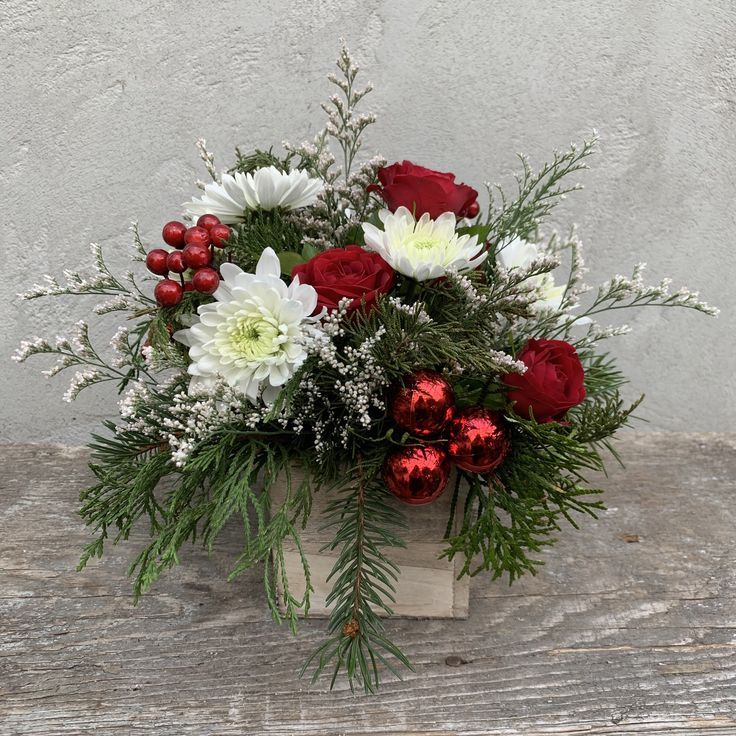 This arrangement is all about beauty and brightness. The flowers used here naturally draw attention due to their vivid presence and festive glow. They create a visually appealing display that complements the holiday theme effortlessly. If you’re hoping to introduce something eye-catching yet tasteful, these radiant blooms fit the bill.
