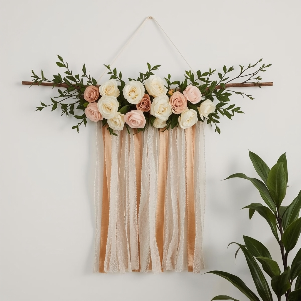 A floral wall hanging is a soft and elegant way to introduce nature-inspired decor into your home. This design works well in living rooms, bedrooms, or even as party decor. Using fabric strips, branches, and artificial flowers keeps the project lightweight and versatile.