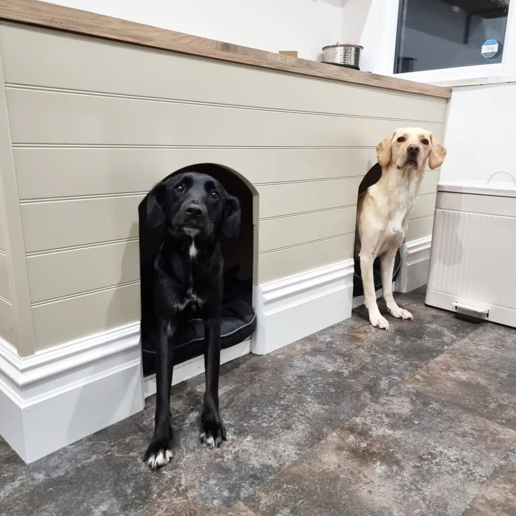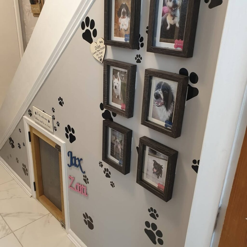 Often overlooked, the space under the stairs can become a charming dog retreat. Turn this small area into a stylish den with a snug bed and framed paw-print art on the walls to showcase your pup’s personality. It creates a cozy nook perfect for napping or quiet time.